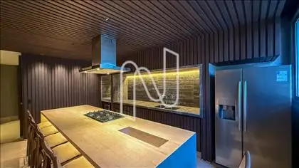 - Cozinha completa, com fogão de indução, coifa, geladeira, forno elétrico, micro-ondas, panelas e armários planejados.