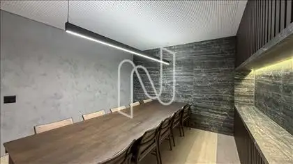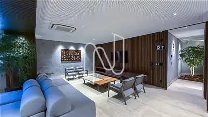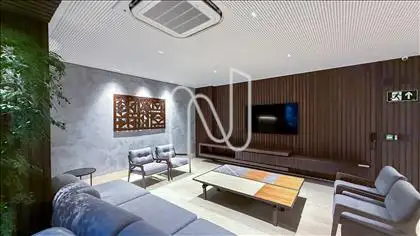 - Sala para dois ambientes com piso em porcelanato, ar-condicionado, sofá, rack com TV, mesa para seis lugares e um projeto de iluminação elegante.