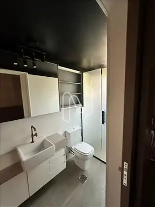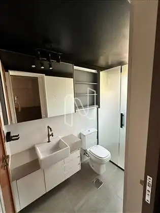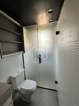 Banhos em porcelanato, tanto no piso quanto na bancada, armários e box blindex
