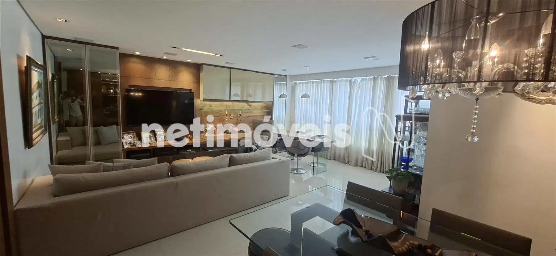 Ampla sala reformada com grande projeto de marcenaria, varanda incorporada, piso em porcelanato 100x100 e cortina de vidro, muito bem ventilado e iluminado com luz da manhã.