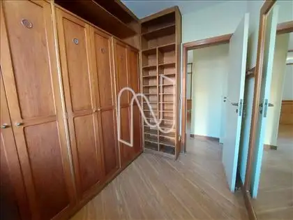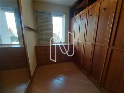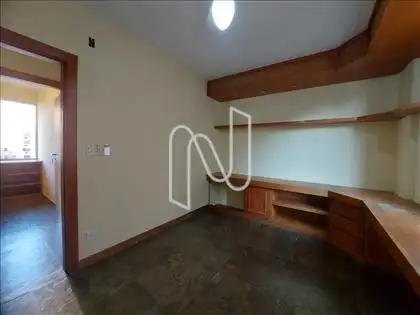 O segundo quarto conta com armários planejados e escritório funcional, janelas em alumínio com venezianas e piso em madeira que proporciona elegância e aconchego.