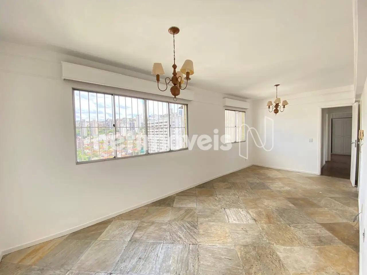 Sala ampla para 02 ambientes com piso em pedra São Tomé.