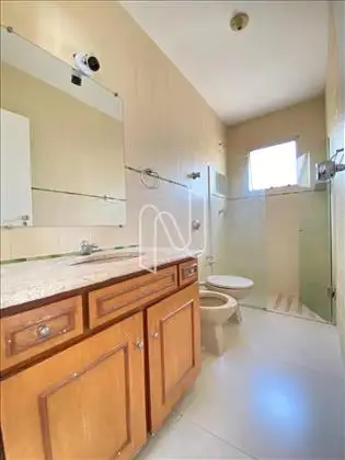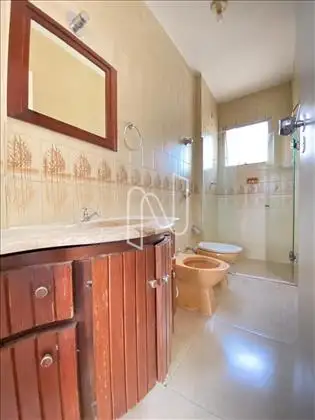 Banho suíte todo azulejado, piso em cerâmica, armário, bancada em mármore carrara, espelho e box em vidro temperado.