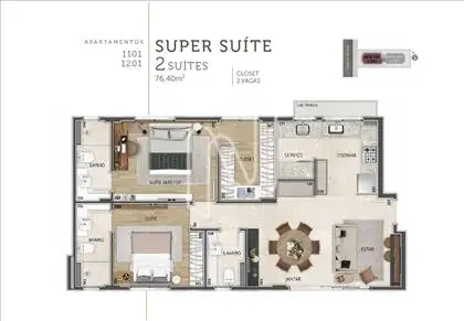 Apartamento 3Q - 2 suítes, closet, cozinha com área de serviço, sala de estar e jantar (ambiente amplo)