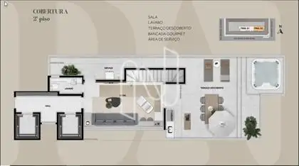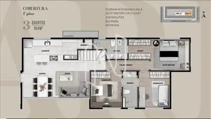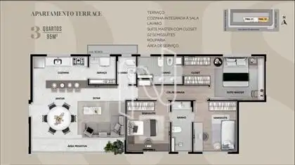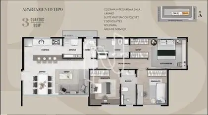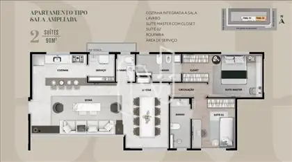 Cozinha integrada à sala, lavabo, suíte máster c/ closet, 2 semis-suítes, rouparia, área de serviço.