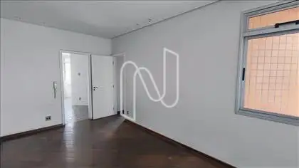 Sala para 02 ambientes, piso tábua corrida, com varanda.