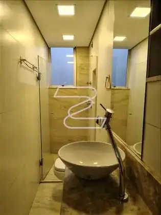 - Banho social com piso e bancada em granito, armários, box bilndex e espelho.