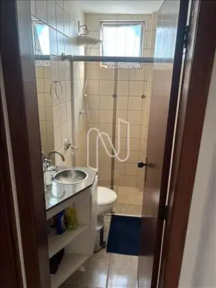 - Banho com bancada em granito, cuba sobreposta, armários e box;
