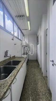 Área de serviço espaçosa, piso granito, armários.