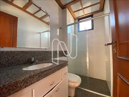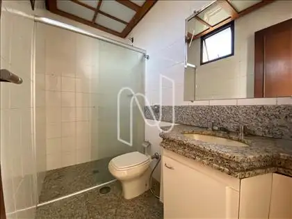 - Banhos, com bancada em granito, armários e box em vidro temperado;