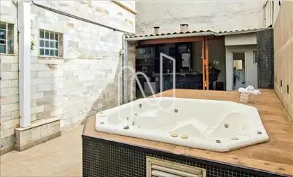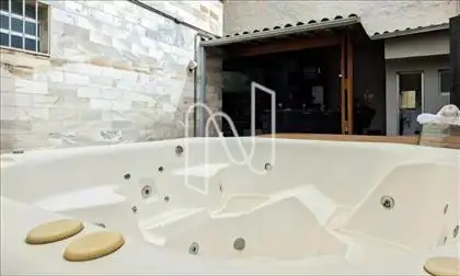 Linda área externa privativa com espaço gourmet, fogão a lenha, banheira de hidromassagem, ducha, banheiro, lavanderia, escritório e jardim.
