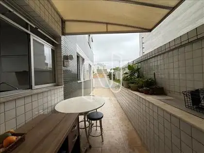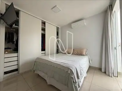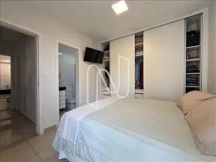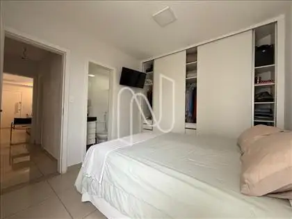 3 quartos em piso laminado com armários, sendo 1 suíte com varanda com fechamento em cortina de vidro