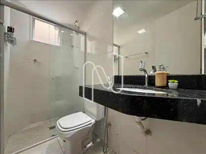 Banho social e suíte com bancada em granito, cuba sobre posta armários